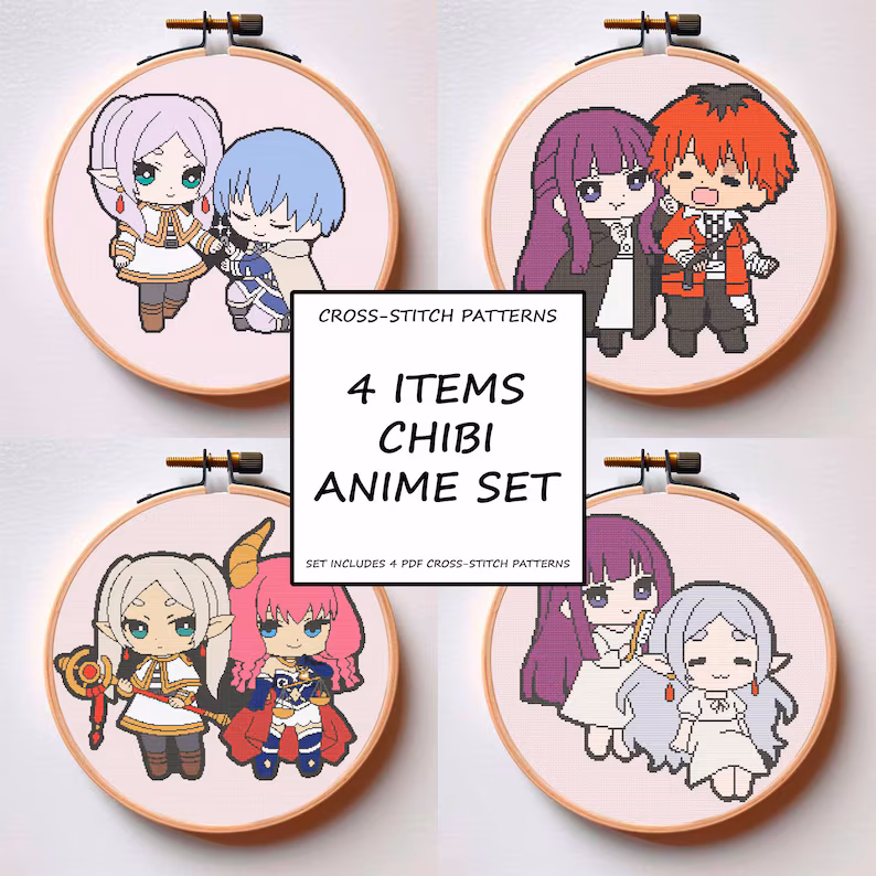 Frieren works especially well in cross-stitch because the characters, fantasy atmosphere, and gentle magic elements translate so nicely into stitched designs.