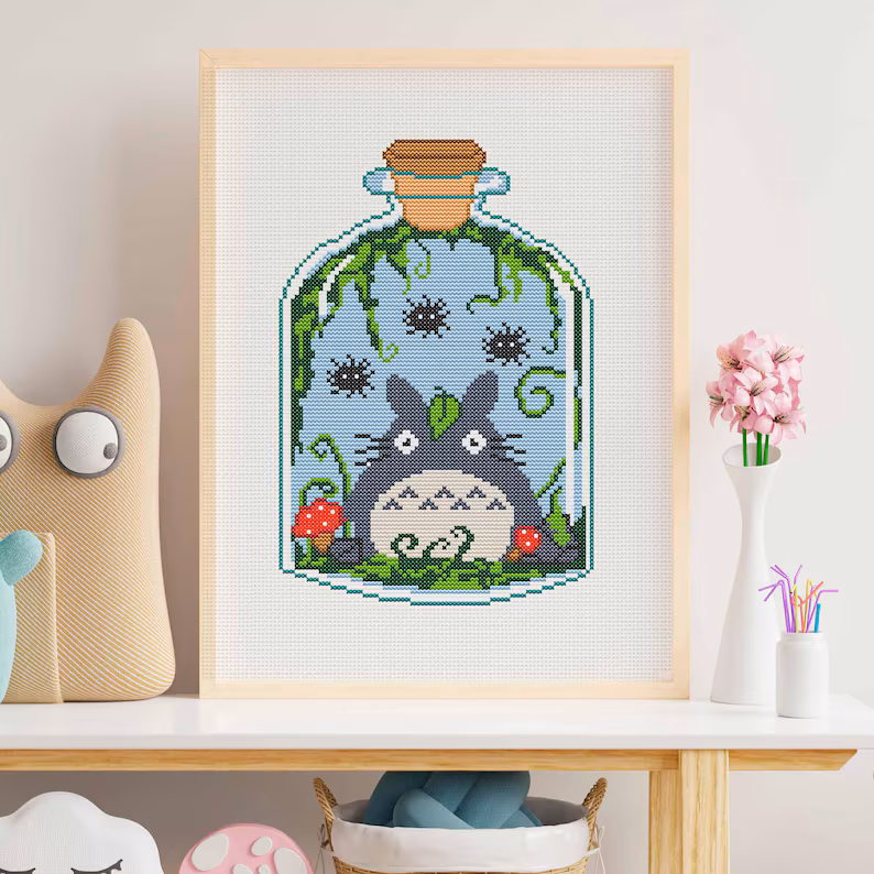 Studio Ghibli-inspired designs often carry that soft, wholesome energy stitchers love — think gentle creatures, dreamy scenery, comforting details, and cozy, colorful charm. It’s the kind of aesthetic that stitches up especially giftable and looks adorable in small hoops, but it can also shine in more detailed, frame-worthy pieces.